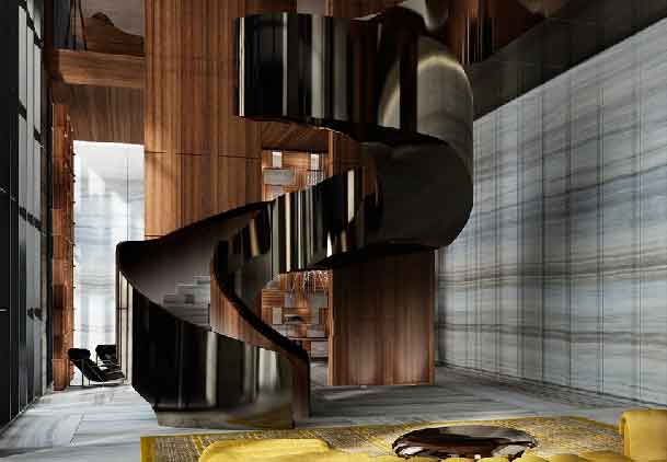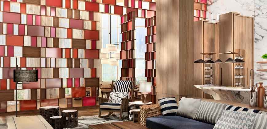 - Grand triple-height lobby accented with stone, wood and stainless steel finishes.